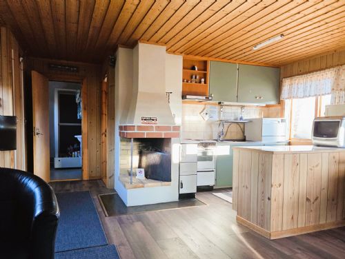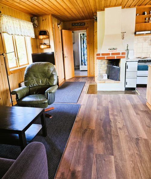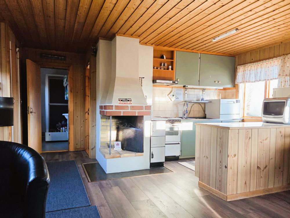 Das Haus verfügt über ein offenes Wohnzimmer zum Essbereich und zur Küche. Ein Wohnzimmer mit einem bequemen Bettsofa 140x200 cm, Sessel und TV mit schwedischen Basissendern. (Der Kamin funktioniert nicht). Ess-und Küchenbereich.