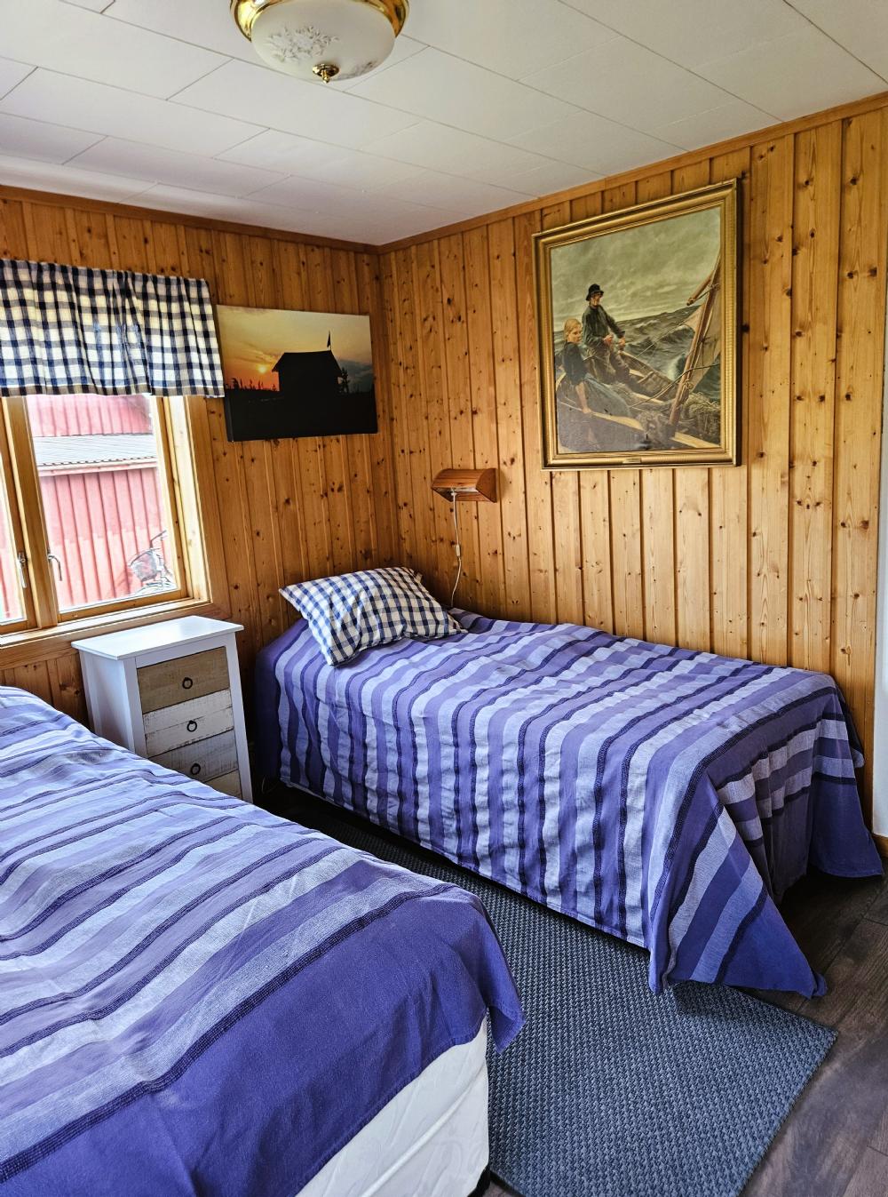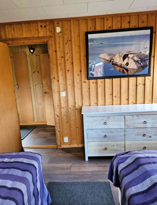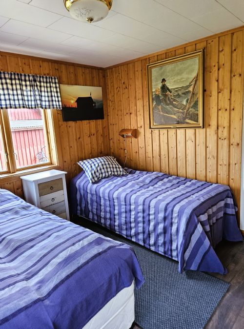Schlafzimmer mit Doppelbett 140x200 cm und einem Einzelbett 90x200 cm. Federkernmatratzen in allen Betten. Badezimmer mit Dusche und WC.