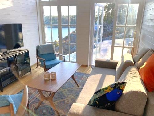 ID3161Exclusive Atterfallshus 30 sqm on a lake plot with panoramic views of the water, private jetty and sauna.