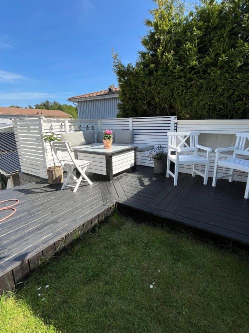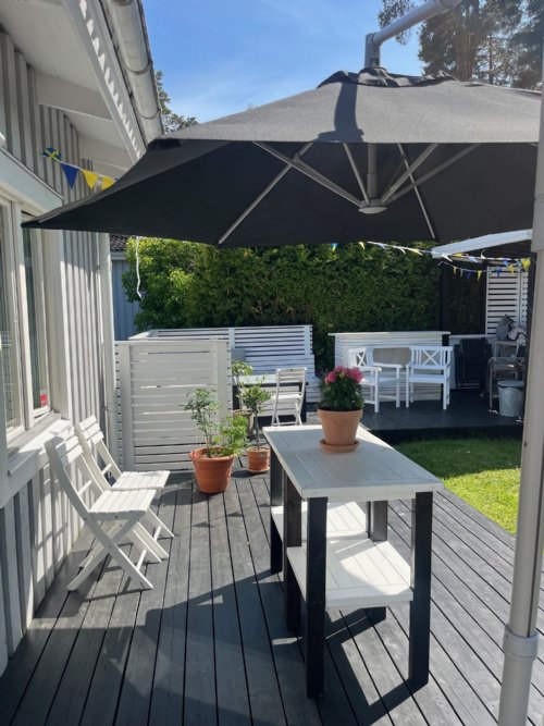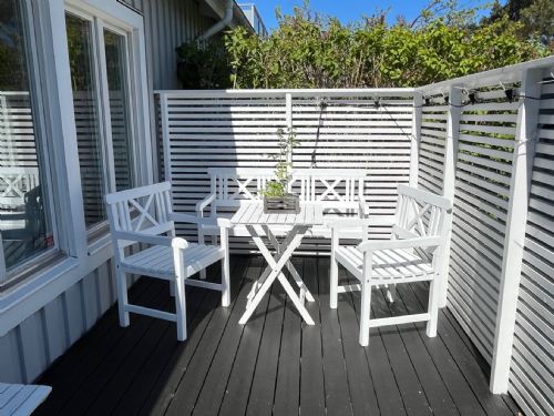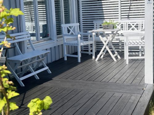 From the upper floor there is an exit to the patio at the back with a sunny southwest location. Embedded in greenery, rocks and trees, it gives a private feeling. Here there is a large wooden deck with a dining and lounge area with a gas grill, as well as a small lawn for playing and games. Ping pong table, badminton, kubb game available to borrow.