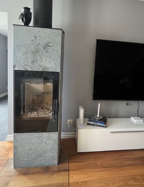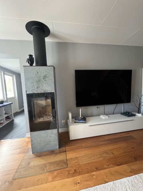 Large and airy living room with comfortable sofa, armchairs and an 80" Smart TV. The living room also has a soapstone stove with glass doors for cozy evenings by the fireplace.