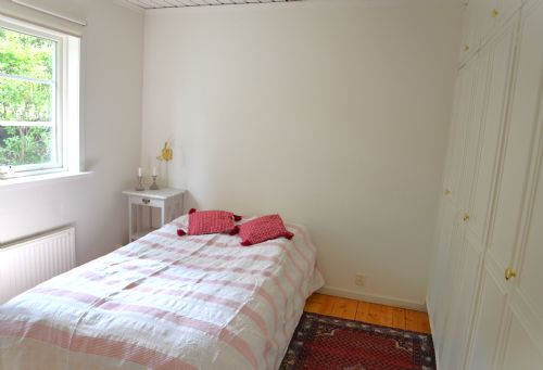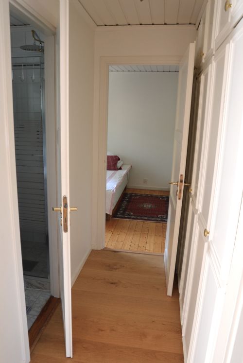 Vidare finns två sovrum, det ena med en bred enkelsäng 120x200 cm med resårmadrass samt garderobsvägg. Det andra med två enkelsängar 90x200 cm med bra skumgummimadrasser. Badrum med dusch och wc. Hall vid badrummet med fler garderober.