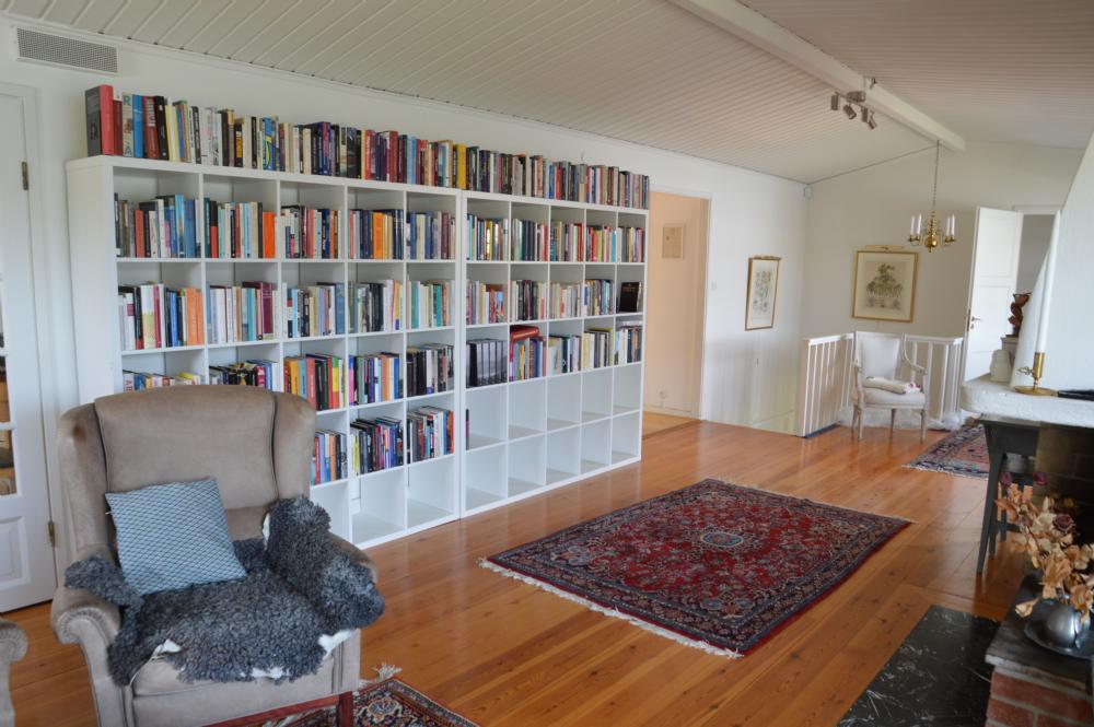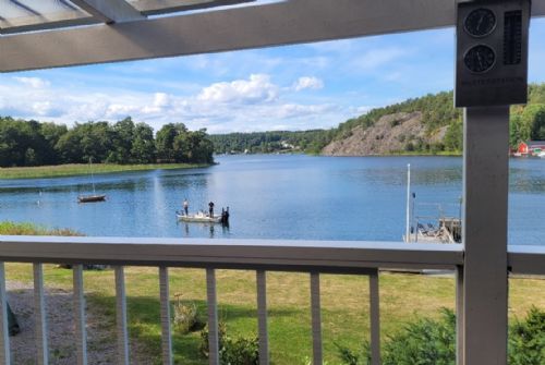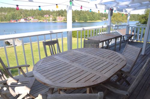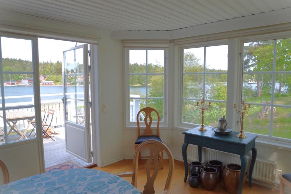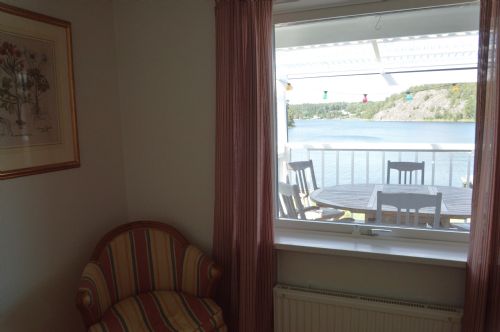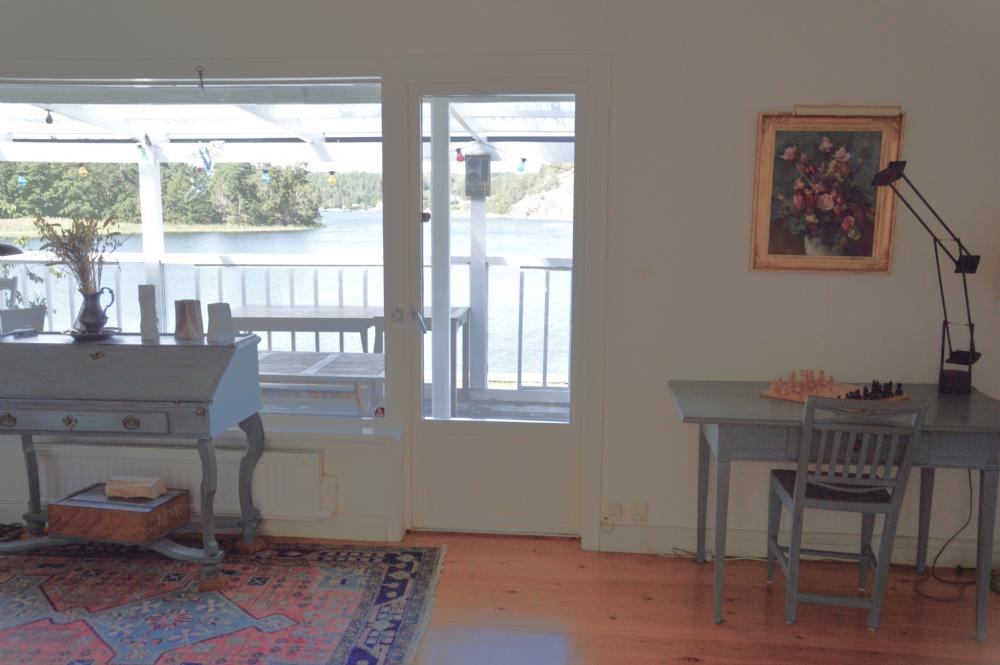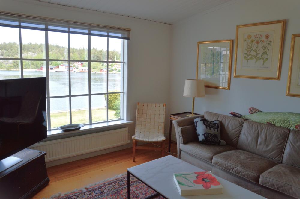 Det stora huset i souterräng har mycket rymliga sociala ytor och stora fönsterpartier mot Myttingeviken. På övre plan finns vardagsrum med underbar utsikt över viken, soffgrupp, sköna fåtöljer, öppen spis och TV. Utgång till stor balkong under tak längs husets långsida mot vattnet där ni kan njuta av kvällssolen och ha trevliga middagar. Här finns en grill och 2 bord med plats för 10 personer.