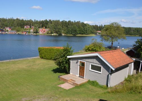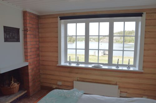 Gäststuga med stort panoramafönster, utsikt över vattnet, äldre fint retro-kök med kyl och spis, matplats samt sovrum med 2 enkelbäddar.