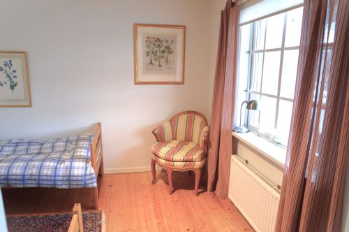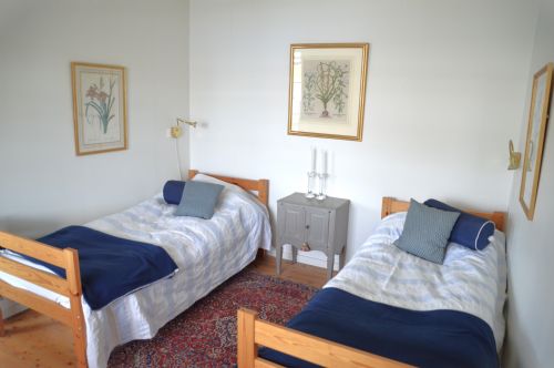 Sovrum tre som är ett stort familjerum har 3 bäddar och en öppen spis. 1 dubbelsäng + 1 st enkelsäng 90 cm med skön madrass.