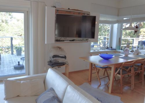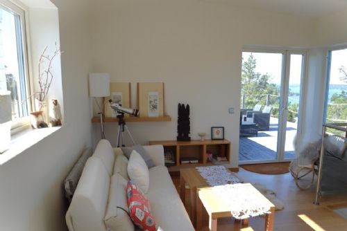 En trappa upp finns ett ljus allrum perfekt för musik eller läsning med 2 soffor som kan bäddas ut som extrabäddar. Bäddmått ca 70 x 175 cm, exakt mått kan fås på förfrågan. Takterrassen med loungemöbler har en fantastisk vy över skog och hav. Obs: Trappan är brant och räcket ej barnsäkert.