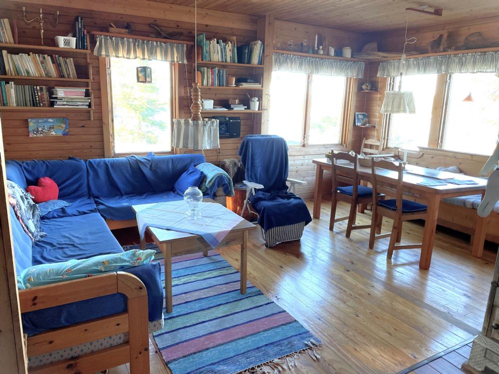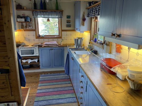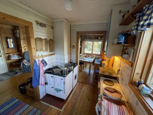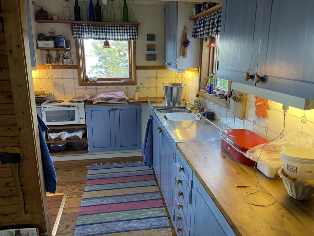 Stora huset har ett allrum med hörnsoffa och täljstenskamin samt matplats vid fönstervägg mot havet i öppen planlösning mot köket. Köket har en stor vedspis ni kan laga mat på, samt en el-bänkspis med 2 plattor och en liten ugn. Perkulator kaffebryggre. Endast kallvatten i kökskranen, koka varmvatten vid behov. Kylskåp med frysdel (högskåp). Det finns inte spisfläkt så kött, fågel, fisk tillagas lämpligen på grillen (undvik att steka inomhus). Det finns flera kolgrillar i olika storlekar. En extra köksbänk ute och tillagning på grill gör matförberedelser och diskmomentet till en härlig naturupplevelse.