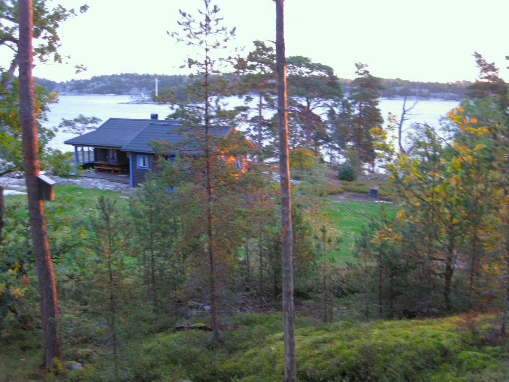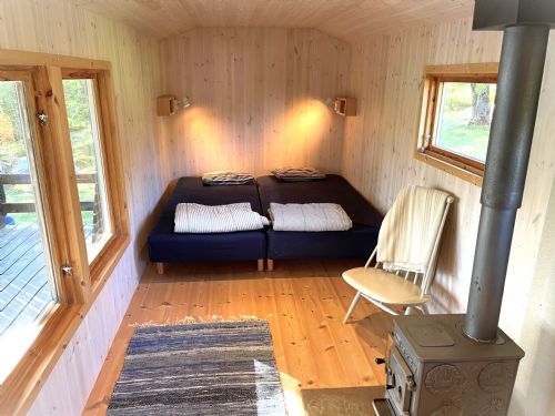 Gäststuga 16 m2 med 2 sovrum; ett större rum med 2 sköna enkelsängar (resårmadrasser) och underbar utsikt mot vattnet.