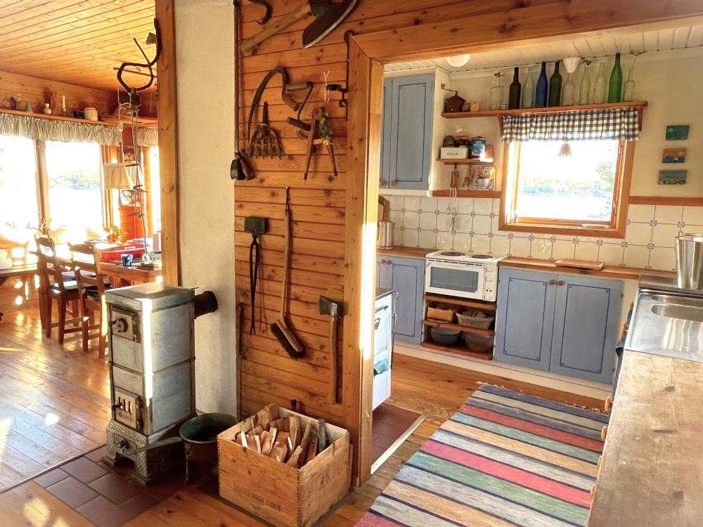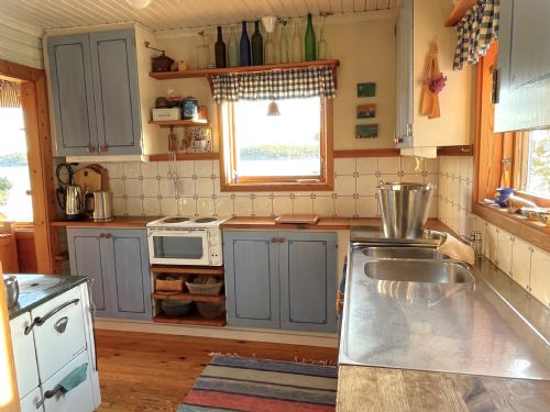 Köket har en stor vedspis ni kan laga mat på, samt en el-bänkspis med 2 plattor och en liten ugn. Perkulator kaffebryggre. Endast kallvatten i kökskranen, koka varmvatten vid behov. Kylskåp med frysdel (högskåp). Det finns inte spisfläkt så kött, fågel, fisk tillagas lämpligen på grillen (undvik att steka inomhus). Det finns flera kolgrillar i olika storlekar. Köksbänk ute för disk och tillagning på grill gör matförberedelser och diskningen till en härlig naturupplevelse.