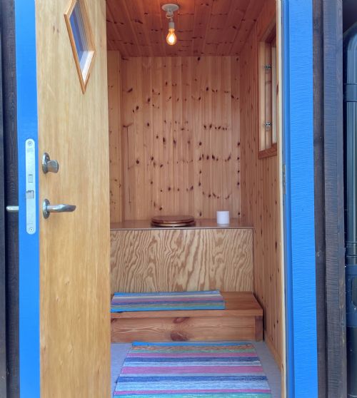 Nybyggt bastuhus 15 m2 med stor vedeldad bastu och ett härligt relaxrum där ni kan sitta och koppla av med den vackra sjöutsikten i blickfång. Här är det nära ner till bryggan och svalkande bad. I bastun värmer ni varmvatten i en behållare på aggregatet för att använda vid tvagning genom att skopa vatten över kroppen på ett mindre trädäck.